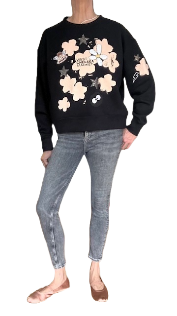 The super soft heavy weight luxury sweatshirt with hand printed flower and glitter appliqué stars/ sequin flower and 'the black blob'